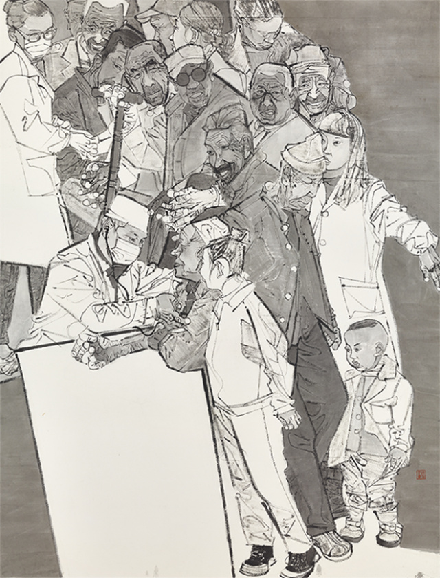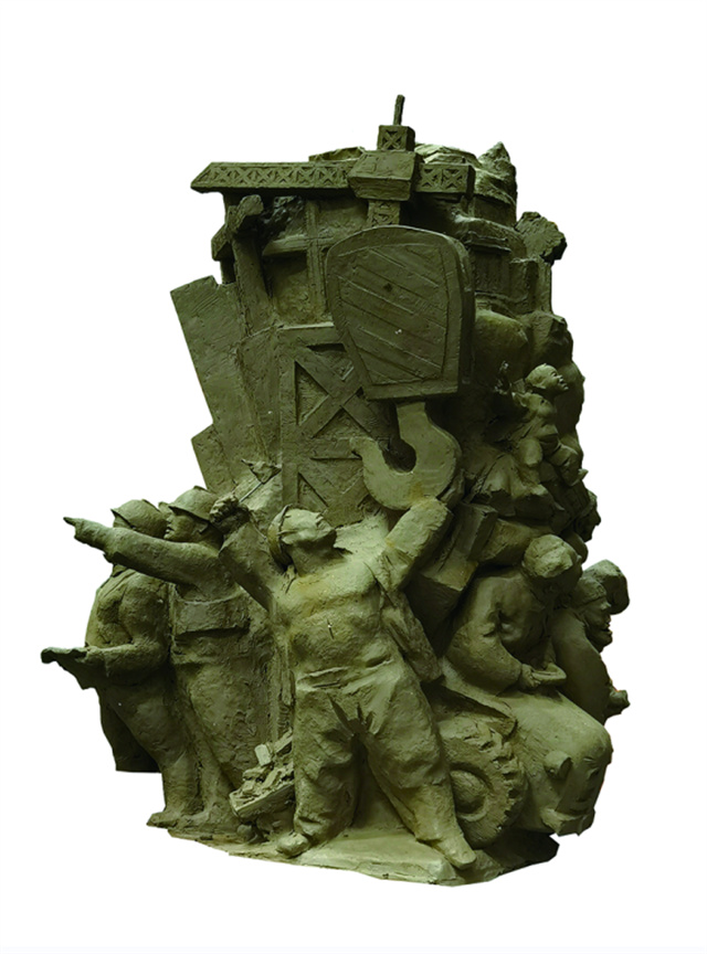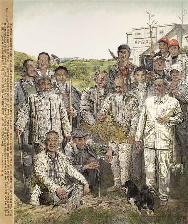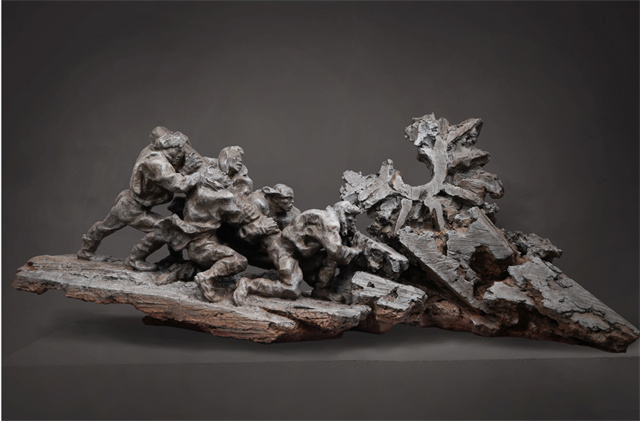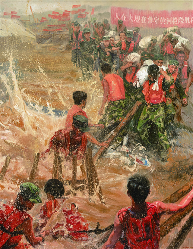缓步展厅,驻足注目,就会感受到作品所投射出的一种难以名状的振奋精神和高尚品格,咏形赋彩的“黄河故事”总会激发出了黄河儿女热爱黄河、利用黄河,保护和建设黄河生态环境,让黄河造福中华民族的热情。周韶华《黄河魂》,将石兽化身为中华民族伟大精神的象征,在黄河浪涛曲线美张力的衬托下,彰显出了黄河生生不息的强大生命力;杨力舟、王迎春《黄河在咆哮》,汹涌咆哮的黄河与逆流奋挣的小舟,形成了强烈的视觉对比,一股奋起力争,勇往直前的决心和力量彰溢于画面;段正渠《黄河的传说》,把黄河鲤鱼乖张难驯的性格,定格为拟人化的黄河儿女拼搏无敌的勇者形象,令观者共情;赵培智《八步沙治沙人》将黄河汉子抗旱治沙,战天斗地的乐观积极呈现给了观者,将黄河精神不畏艰险、追求幸福的内涵通过真实形象得以展现,站在画前,面对八步沙治沙人,似乎是在和质朴对话,与勤劳共勉。