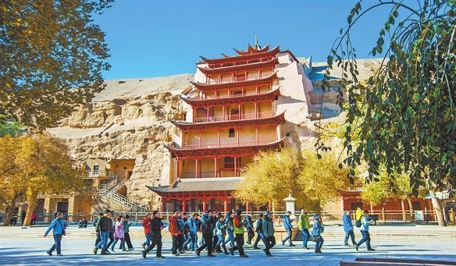 游客在莫高窟景区参观游览。新甘肃·甘肃日报通讯员 王斌银