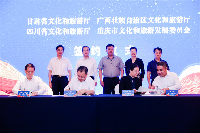 ——“环西部火车游”。“环西部火车游”是由甘肃省文旅厅与中国铁路兰州局集团公司于2018年4月联合推出的铁旅融合王牌旅游产品,被誉为陆上邮轮、梦想旅游专列。甘肃省文旅厅联合中国铁路兰州局集团于2020年5月1日串起敦煌到陇南12个站点,打通了省内小环线;8月1日开始跨省推广,打通了甘川渝陕宁青“1+5”中环线;10月1日从甘肃到广西再到新疆,途经九省区市8000公里,形成了连接“陆海丝”、对接东盟与中亚的大环线。其中,2020年下半年,由省文旅厅牵头跨省跨界组织开展了声势浩大的“联通陆海丝·助推双循环”——甘肃文旅“环西部火车游”主题推广营销活动,合力奏响文化和旅游系统“你中有我、我中有你”的大联动、大协作、大发展“交响曲”,成功实现了“环西部火车游”连接联通陆上丝绸之路和海上丝绸之路大环线的预期目标。此主题推广营销活动获评“2020年度中国文旅营销创新典范”,入选2020年国内旅游宣传推广典型案例,“环西部火车游”产品因此更加走红走俏。2018—2021年,“环西部火车游”累计开行专列178列,组织游客15.67万人,实现旅游收入1.37亿元。2022年,省文旅厅与平凉市政府、中国铁路兰州局集团合作,开通运营“环西部火车游·崆峒号”品牌列车,从兰州出发至平凉每周往返运行一趟,着力打造交旅融合的“平凉样板”。