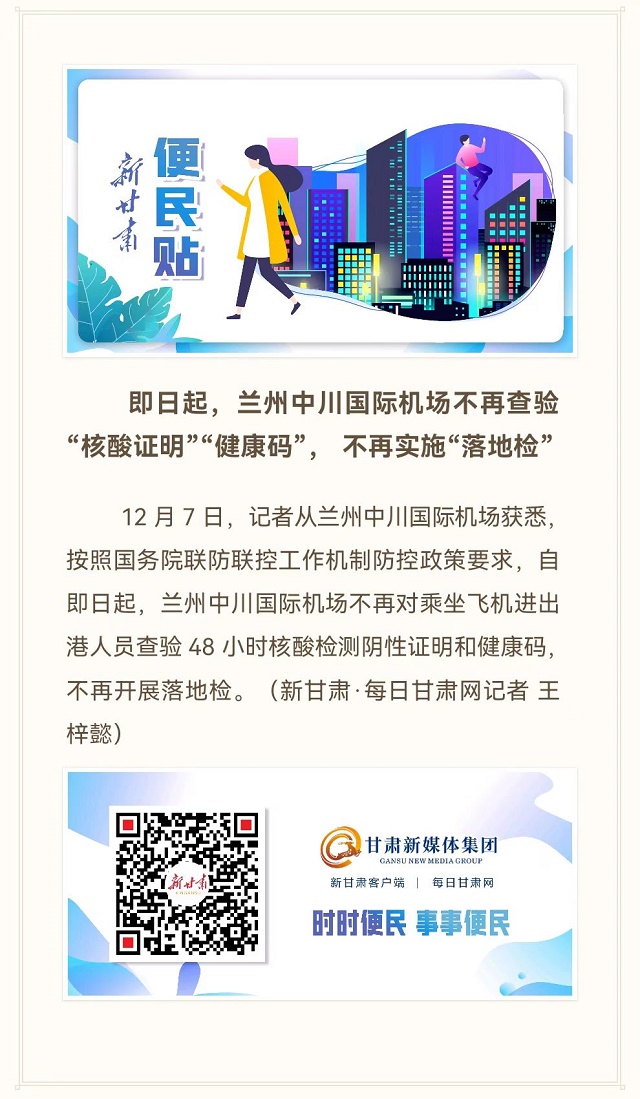 兰州中川国际机场不再查验“核酸证明”“健康码”, 不再实施“落地检”