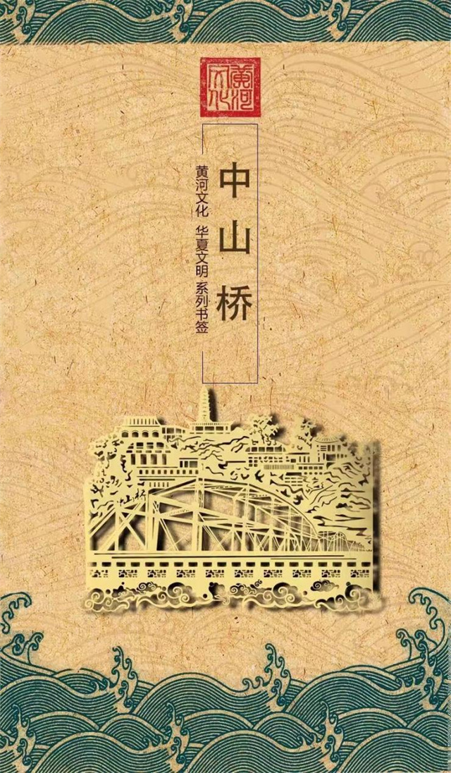 中山桥书签以中山桥为视觉中心,横跨黄河,下部是富有装饰的浪花纹样,桥后为白塔山公园和仿古建筑群,高耸的白塔矗立山巅,将中山桥和美丽的环境融为一体,展示了黄河子孙天道酬勤,一分耕耘、一分收获的美好品质以及百姓安居乐业、社会和谐稳定的美好景象。