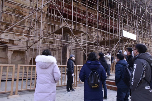 在北石窟寺现场,可以看到多体量、多结构脚手架支撑起的保护棚罩,窟龛轮廓在钢架保护网中若隐若现。据了解,近年来,北石窟寺先后开展了砂岩防风化、文物保护维修、文物数字化、壁画彩塑维修、保护规划修编等方面的保护项目。