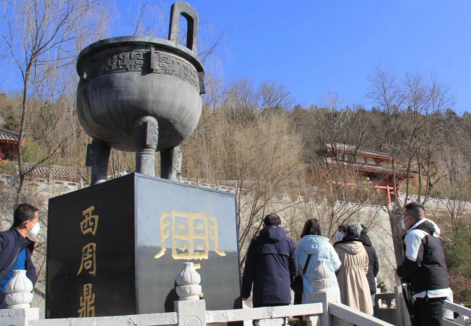 沐浴着冬日的暖阳,沿荆山门拾阶而上,左侧是休闲广场,右侧便可看见西周铜鼎雕塑。原鼎现存放于省博物馆,是我省目前发现最大的一口鼎。重43公斤,高60厘米,口径45.7厘米,面饰饕餮图文,壁上铭刻族辉,工艺精湛,造型优美,是灵台悠久历史文化的象征之一。漫步荆山之上,以古建筑为特色,形成了荆山门、三贤祠、德画廊、朝晖亭、夕照亭、日月亭、关公爵、灵通门、玉皇阁、等人文景观。