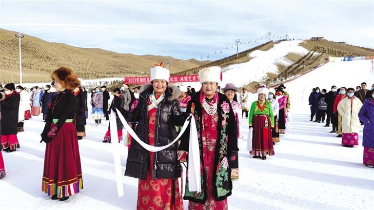 每日甘肃网1月9日讯 据兰州晚报报道 1月8日,在“文化进万家 旅游迎新春”百日攻坚行动深入推进之际,第五届“相约乌鞘岭 冰雪嘉年华”冰雪艺术节在武威天祝正式启幕。当日,在冬阳的照耀下,欢快的锅庄舞热了乌鞘岭,皑皑冰雪场缤纷了天祝的冬天。
