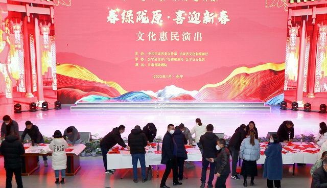 当天的文艺惠民活动在会宁县文旅传媒中心演播大厅举行。首先是由甘肃画院、省文化馆、省青年书协文艺工作者开展的写春联送祝福活动,一副副寓意新年新气象的大红春联,写满对未来美好的祝愿,传递着浓浓的年味,市民群众领到心仪的对联后脸上洋溢着开心的笑容。随后,省陇剧院的艺术家们倾情奉献了一台精品荟萃的文艺演出,戏曲、器乐、歌曲、舞蹈等不同形式的节目赢得现场观众的阵阵掌声和喝彩声。