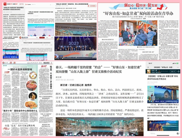三是媒体宣传密集造势,着力营造“引客入甘”浓厚氛围。构建声势浩大的主流媒体和新媒体传播矩阵,邀请甘肃、山东两省主流媒体聚力聚焦,扎实做好活动前期预热、现场报道、后期跟进等系列宣传。组织《新甘肃》《微游甘肃》等网络客户端对2场推介活动进行了现场直播,浏览量达275.7万人。《甘肃日报》《新华网》《人民网》《中国旅游报》《凤凰网》《环球网》《大众日报》《山东卫视》《济南日报》《青岛日报》等省内外媒体和两省市媒体密集报道,全媒体宣传报道呈现出多层次、多视角、大流量、高密度的喜人局面。截至2月22日,有关本次活动的报道稿件、视频图文等在省内外媒体推送240多篇(个),总阅读量超过2000万。