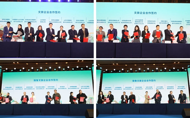 二是签约洽谈富有实效,双向发力谋求深度合作共赢。充分发挥政府和市场“两只手”作用,组织双方省、市文旅部门和文旅企业3个层面共签订20份合作协议,全面推进两省文化交流互鉴、文旅资源互通共融、文旅品牌共建共享、旅游客源互推互送,带动跨省旅游消费持续升温,力求形成鲁甘文旅协作共荣发展的“最大公约数”和“最大综合效应”。其中,甘肃省文化和旅游厅与山东省文化和旅游厅签订《深化甘肃与山东文化和旅游业合作发展的协议》,主要包括加强文旅品牌和资源推广、联合推进文化和旅游产业合作发展等七个方面的合作事项;临夏州文化广电和旅游局与济南市文化和旅游局签订《共建共享旅游资源市场战略合作协议》,包括加强旅游人才交流培训、开展旅游消费帮扶行动等六个方面的合作事项;定西和陇南两市文旅局分别与青岛市文化和旅游局签订《战略合作协议》,主要包括开展双向开展文化旅游交流活动、相互组团开展旅游包机旅游专列业务等三个方面的合作事项;甘肃兰铁国际旅行社与山东中铁文旅发展集团、嘉峪关君和国际旅行社与康辉旅游集团山东国际旅行社等两省32家旅行社分别签订《“好客山东·如意甘肃”双向游市场化客源互送合作协议》,包括相互组团开展“双向游”以及联合优化精品旅游产品线路设计、拓宽产品销售渠道等具体合作事项。同时,组织甘肃省随团参加的60多家文旅企业(旅行社),与山东省120多家文旅企业(旅行社)负责人面对面洽谈、市场化对接,双方协商全年面向甘肃发团5100余个,组织山东旅行商深入河西走廊、陇东南和甘南等地进行“引客入甘”考察踩线活动,预计向甘肃输送游客16.26万人次。