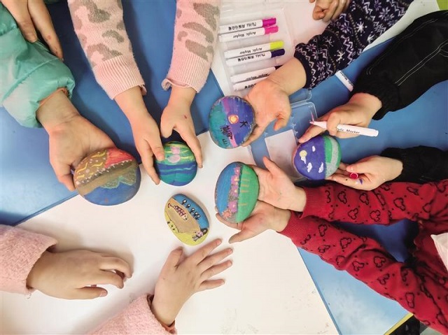 在游戏和彩绘环节,小朋友们专心致志地进行了创作,各执彩笔在形态各异的黄河石上描绘出心里最美的家乡。他们有的画出了绿意盎然的南北两山,有的画出了奔腾不息的黄河,还有的则定格了风景名胜,每一笔都注入了他们对家乡那份稚嫩却诚挚的情感,在一颗颗幼小心灵中埋下了爱的种子。