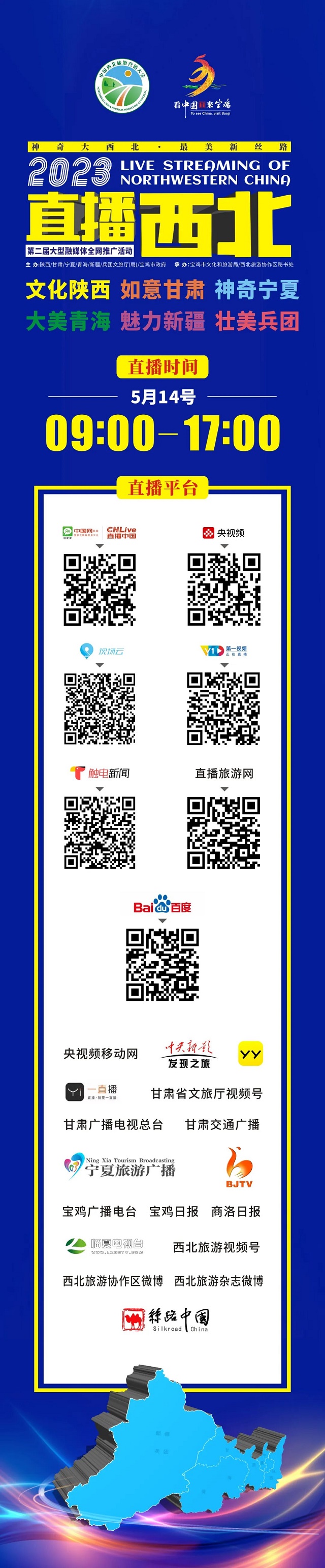 为了向国内外宣传推广西北地区文化旅游特色,2023中国西北旅游营销大会线上互动项目一一2023“直播西北”大型融媒体全网推广活动将于5月14日(星期日)上午9时启动。