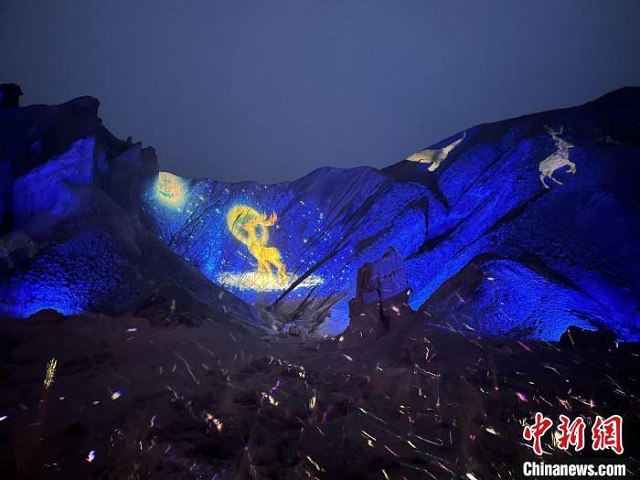 5月3日晚,甘肃张掖市七彩丹霞旅游景区万象土林谷举行《阿兰拉格达》沉浸式梦幻山谷光影演绎吸引游客。杨艳敏摄