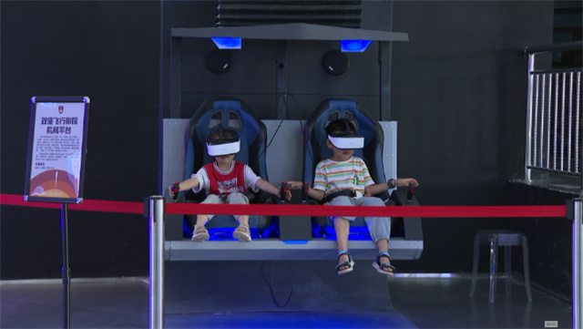 游客正在体验双座飞行影院机械平台项目(张玉龙 摄)