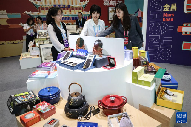 9月6日,与会嘉宾在第六届丝绸之路(敦煌)国际文化博览会上参观文创产品和文旅装备展销活动。