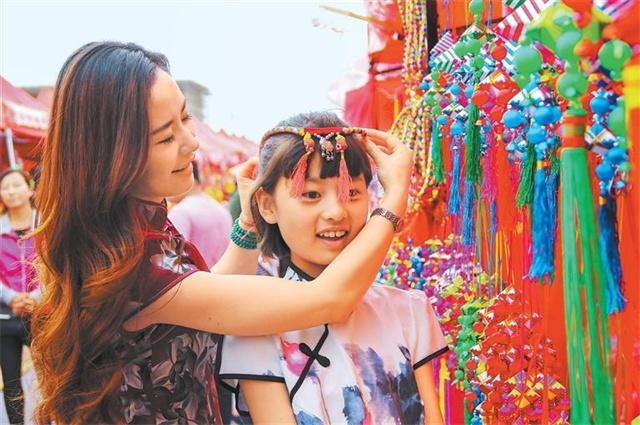 游客在庆阳香包展上选购头饰 陈飞