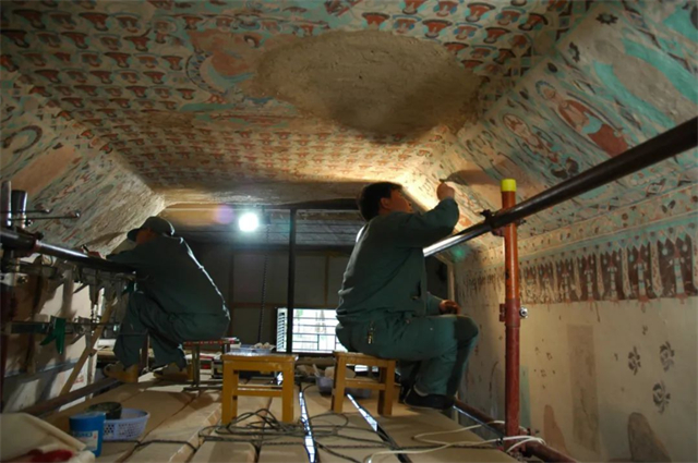 敦煌研究院保护研究所工作人员修复莫高窟第320窟。孙志军 摄