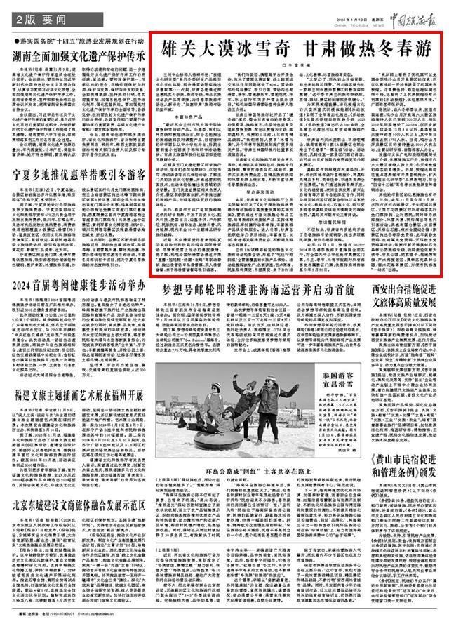 甘肃省文化和旅游厅相关负责人表示,将持续实施旅游包机、旅游专列等措施,集中打造参与式、体验式、康养式文旅消费业态,在精品旅游线路和冰雪资源上做文章,不断丰富甘肃冬春季旅游业态。