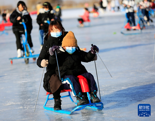 1月1日,市民在甘肃张掖国家湿地公园滑冰场坐滑冰车。新华社发(陈礼 摄)
