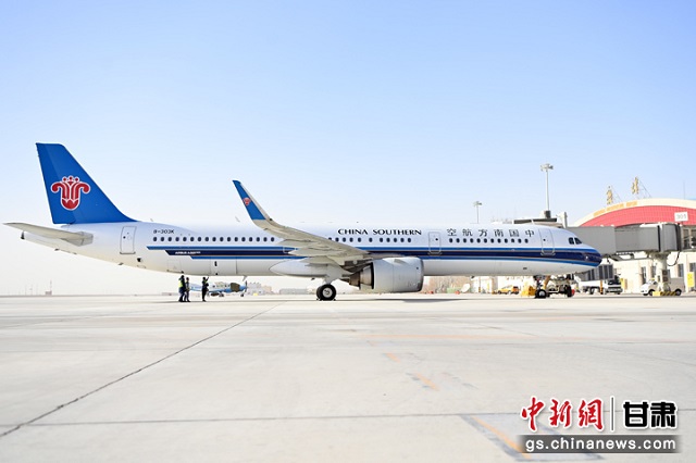 1月12日,2024年首批韩国入境旅客落地敦煌莫高国际机场。这是敦煌首次开通韩国首尔航线。图为韩国首尔至敦煌的旅游包机顺利抵达敦煌莫高国际机场。九美旦增 摄