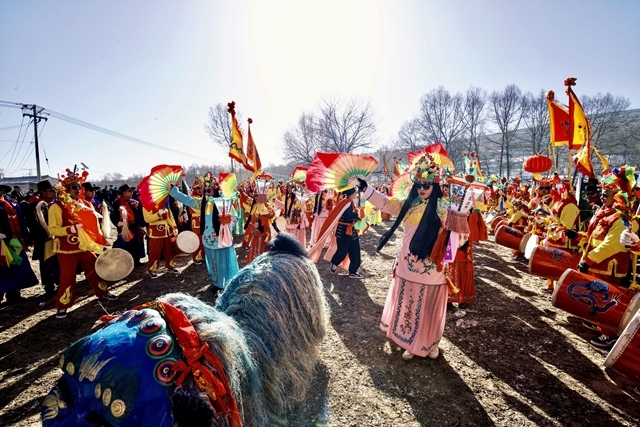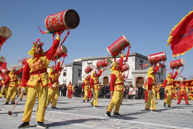 中午十二点,表演正式开始。村前的广场被观众围得水泄不通,队员们整齐地排成了一个方队,在总指挥的旗帜指挥下,开始舒缓地表演了起来,鼓声震耳欲聋,随着指挥速度的加快,队员们开始飞舞了起来,鼓声也随之变得陡峭,仿若悬崖,好似黄河奔涌,又如万马从山坡上奔腾而下。在场的来自全国各地的宾客和观众们,被惊得目瞪口呆,一时间掌声四起。