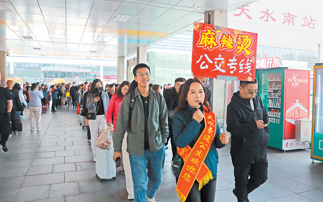 在天水南站出站口平台,工作人员引导游客乘坐“麻辣烫公交专线”。