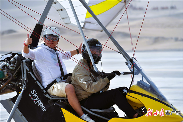 鸣沙山景区内,游客对飞行项目点赞。新甘肃·甘肃日报记者 马伊星 摄