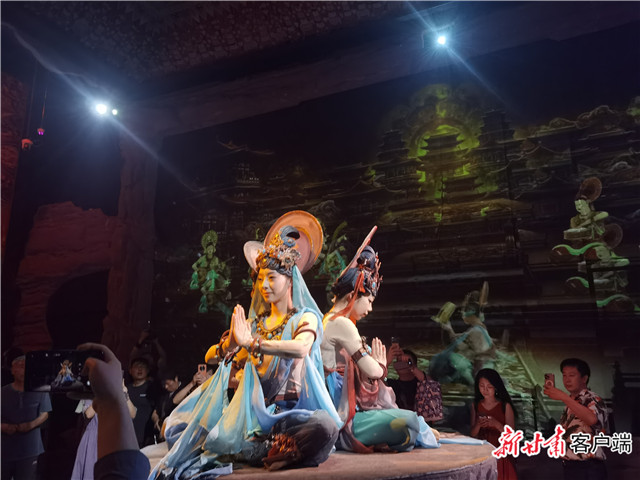 入夜,走进全球首部洞窟式沉浸体验剧《乐动敦煌》剧场,跟随剧中主角的舞动轨迹,游客边走边看,仿佛一场穿越之旅:金刚、飞天、触手可及,花雨缤纷、宛若神话。