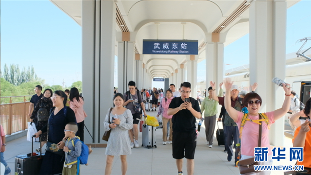 “列车前方到达武威东站,请各位旅客拿好个人物品,有序下车……”广播响起,C9831次列车缓缓驶入武威东站,游客们拿起背包,走出车厢,在站台上相互问候。