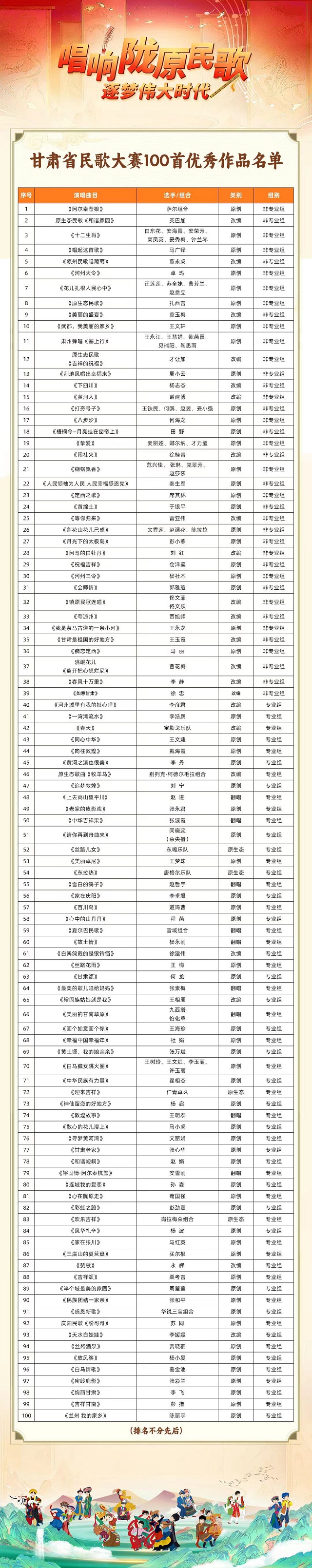 甘肃省民歌大赛100首优秀作品名单
