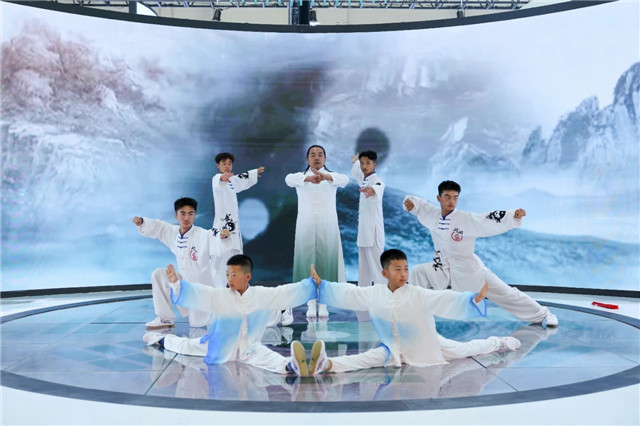 在崆峒养生太极拳交互体验系统前,通过体感游戏,游客随着屏幕上人物挥拳、出拳、跳跃,自己的动作就可以与虚拟环境进行交互,实现沉浸式、交互式深度体验崆峒武术拳法的奥秘。