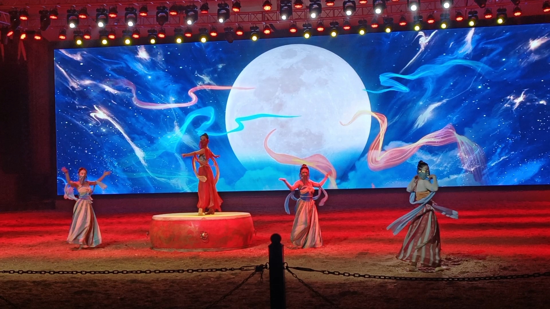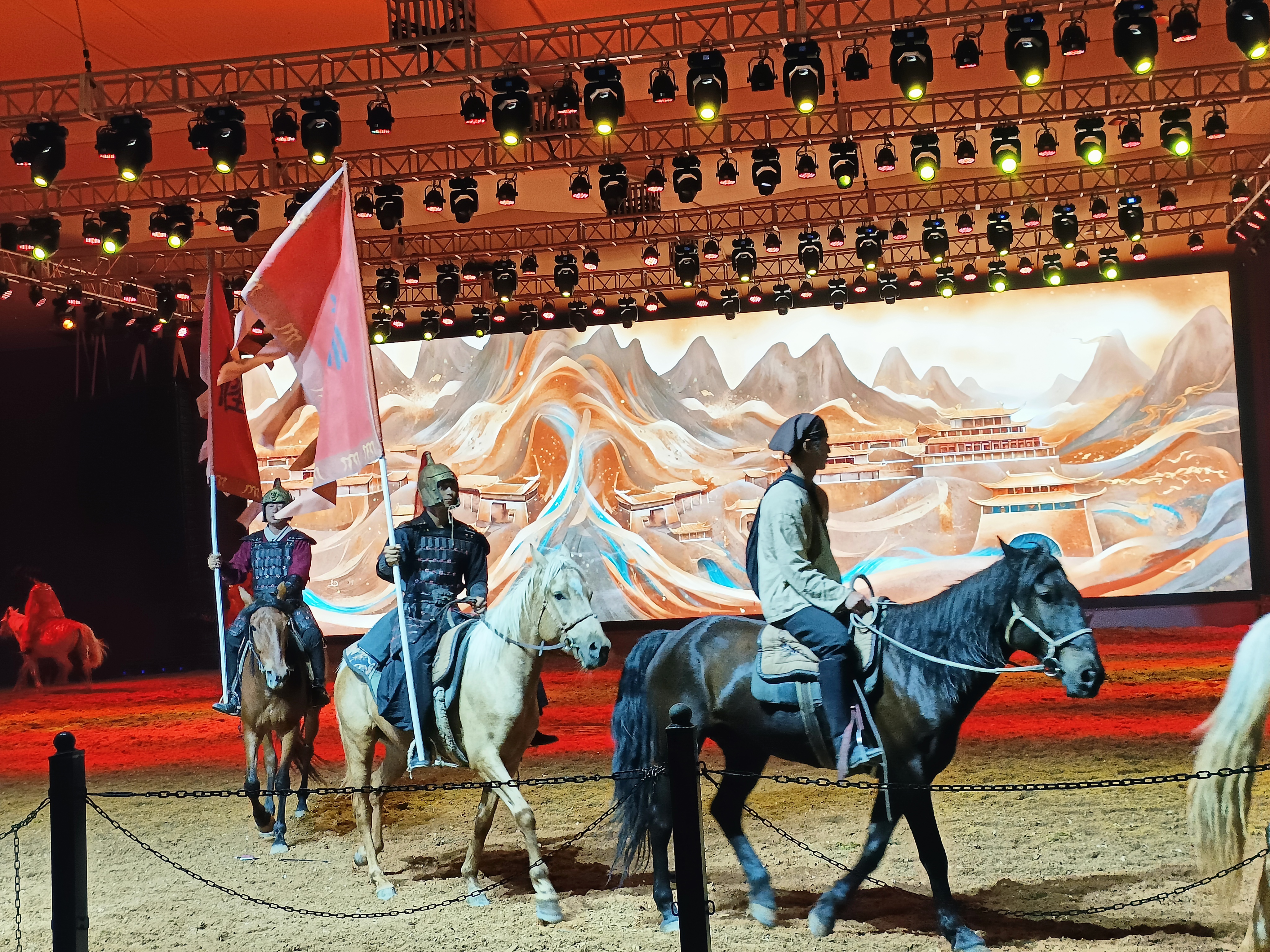 在水墨丹霞景区,观看了震撼人心的《舞马丹霞》马文化实景演出。演出现场,全场座无虚席,马术和舞蹈完美结合演绎,让游客身临其境体验策马扬鞭、沙点兵场、胡服骑射……时空交换感受金戈铁马、吹角连营的历史氛围,展现甘肃悠久历史和丝路文化。