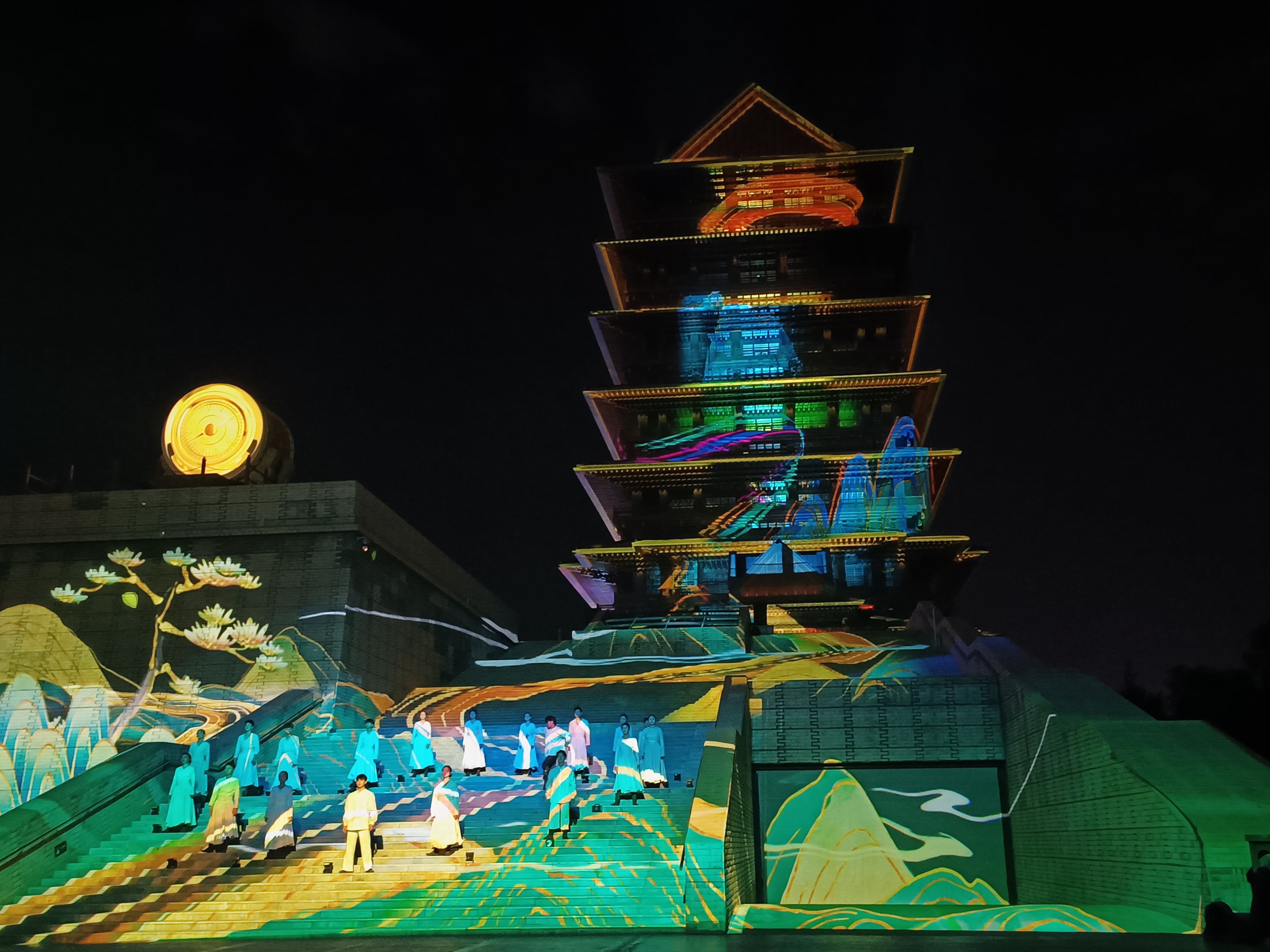 夜幕降临,黄河楼精心策划的“黄河颂·大有兰州”3D Mapping光源秀,灯光的演绎与演员的舞蹈相结合,通过四个篇章“源之大河”、“金之大城”、“民之大韵”、“兰之大州”,共同诉说了兰州千百年来的故事,为游客提供独特的视觉盛宴。