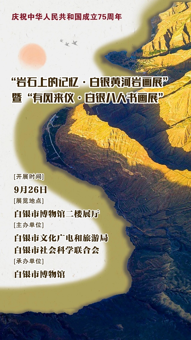 为庆祝中华人民共和国成立75周年,由白银市文化广电和旅游局(文物局)、白银市社会科学联合会主办,白银市博物馆承办的“岩石上的记忆·白银黄河岩画展”暨“有凤来仪·白银八人书画展”将于9月26日(星期四)上午在白银市博物馆开展,向祖国献礼,听山河远阔,共贺盛世华诞。