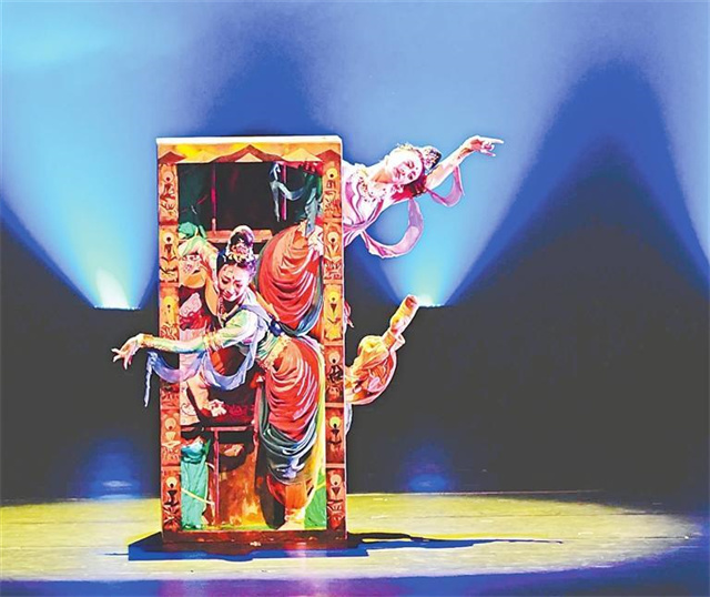 舞台上,长绸飞扬,舞者身姿徐缓而抑扬顿挫,模拟飞天形象的飘忽回旋,不仅再现了壁画艺术的灵动之美,更寓情于景,使观者仿佛亲历那段文物蜷曲行箱、扶摇天涯却难觅归途的沧桑历程。