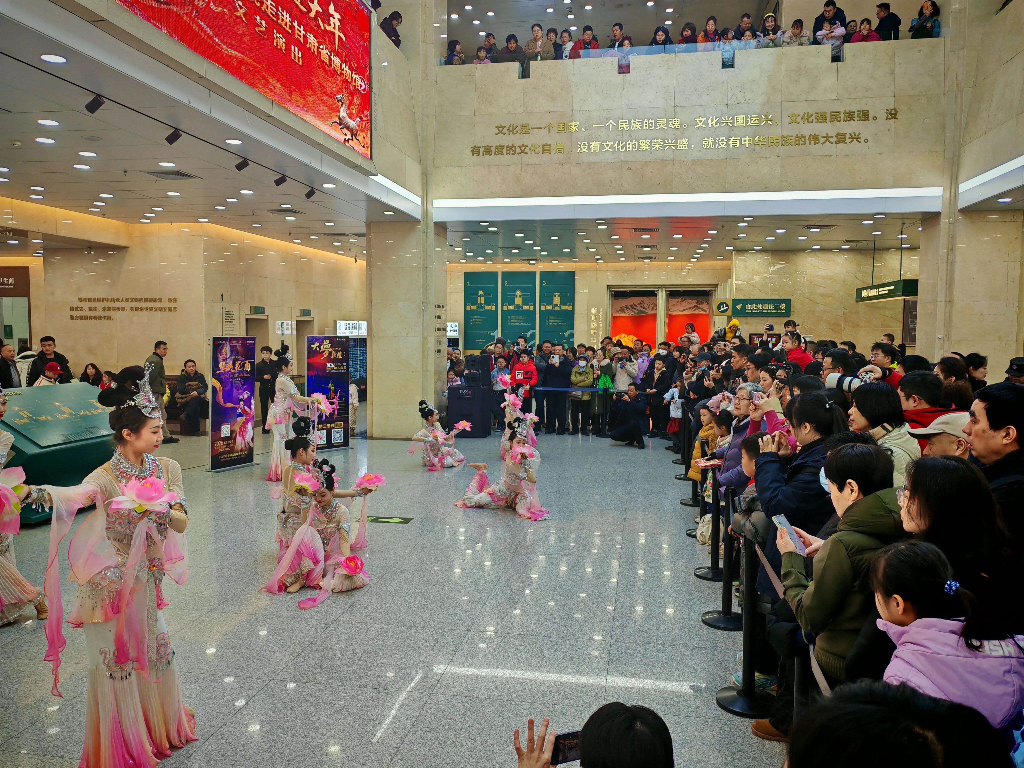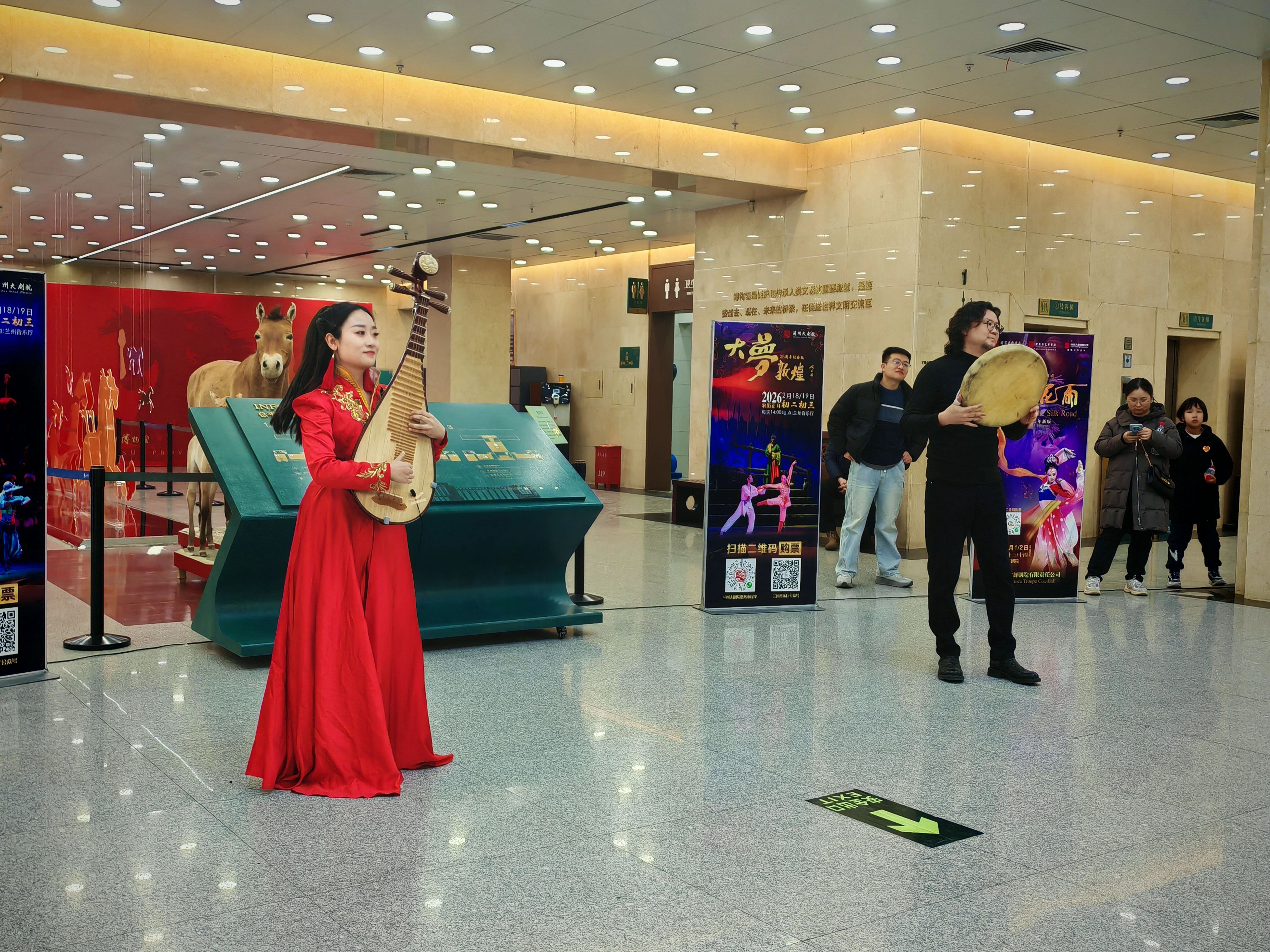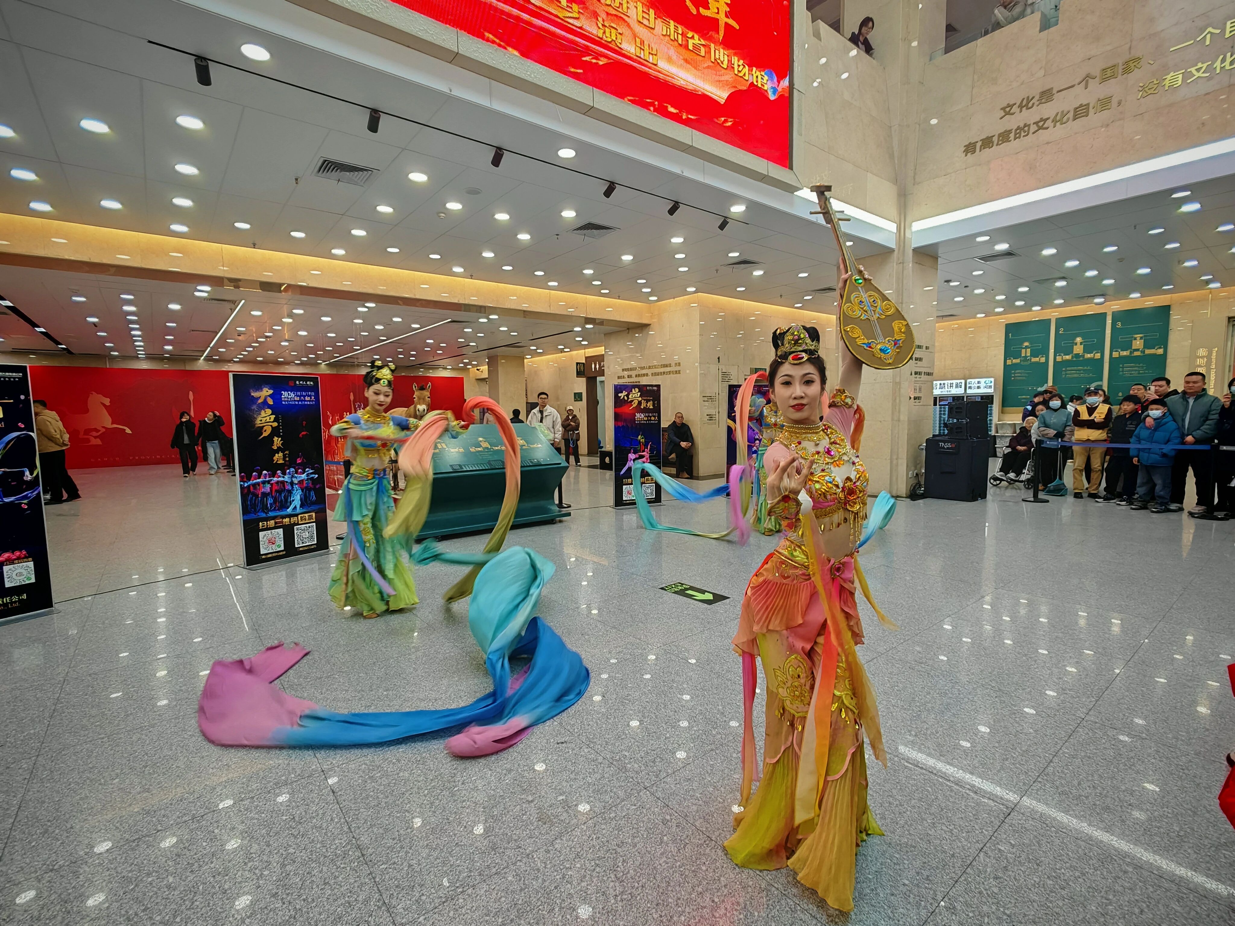 2月17日10时,随着悠扬的乐曲声响,甘肃省博物馆一楼大厅瞬间被观众包围。由甘肃省歌舞剧院带来的敦煌古乐、经典民乐、特色舞蹈沉浸式展演,为现场观众带来了一场丝路艺术的震撼体验。《金光千佛》《战马奔腾》《反弹琵琶·长绸舞》等经典节目接连上演。来自湖北的游客阮子航大年初一专程前来打卡,她兴奋地说:“我们从湖北来,兰州是西北游第一站,接下来还要去张掖、敦煌,专门来省博就是感受丝路文化。我本身学音乐,这里敦煌味的舞蹈和民乐特别惊艳,和湖北完全不一样,丝绸之路的文化魅力太吸引人了。”