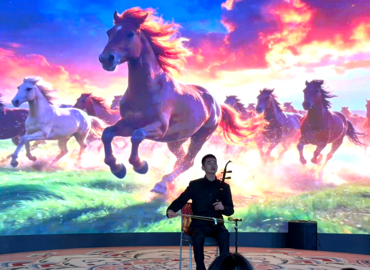 2月20日,在敦煌艺术馆内,“策马迎春,骏‘艺’奔腾”主题活动精彩上演,孩子们化身“小小寻宝家”,在《张骞出使西域图》等壁画中寻找千年骏马,踮脚探看、欢呼不断。“这儿!这里也是!”随着讲解员的细致指引,孩子们的小手纷纷指向壁画,眼神里满是好奇与兴奋。随后,深圳图书馆民族乐团团长李千龙登台献艺,一曲《赛马》激昂奏响。弓弦间,万马奔腾的气势扑面而来,现场观众屏息凝神,仿佛置身于辽阔草原。