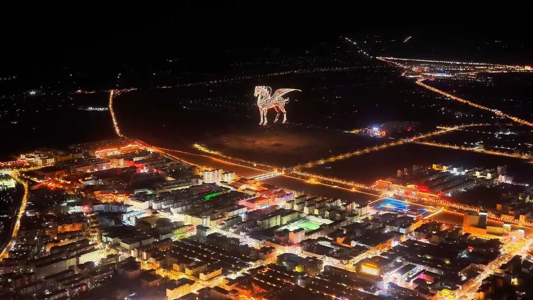 夜幕降临,星河璀璨。随着光影矩阵升空,“中国年 敦煌行”鎏金大字率先点亮苍穹,向世界发出诚挚邀约。整场展演以敦煌文化为脉络,分篇章呈现经典意象与时代图景,将莫高窟、九色鹿、美人菩萨、张骞、翼马、团花藻井、祥云纹样等壁画元素一一“搬”上夜空,让千年壁画在星空下“活”起来。表演还融入敦煌高铁等现代符号,实现古丝路文明与新时代发展的时空呼应,内容兼具文化内涵与时代气息。