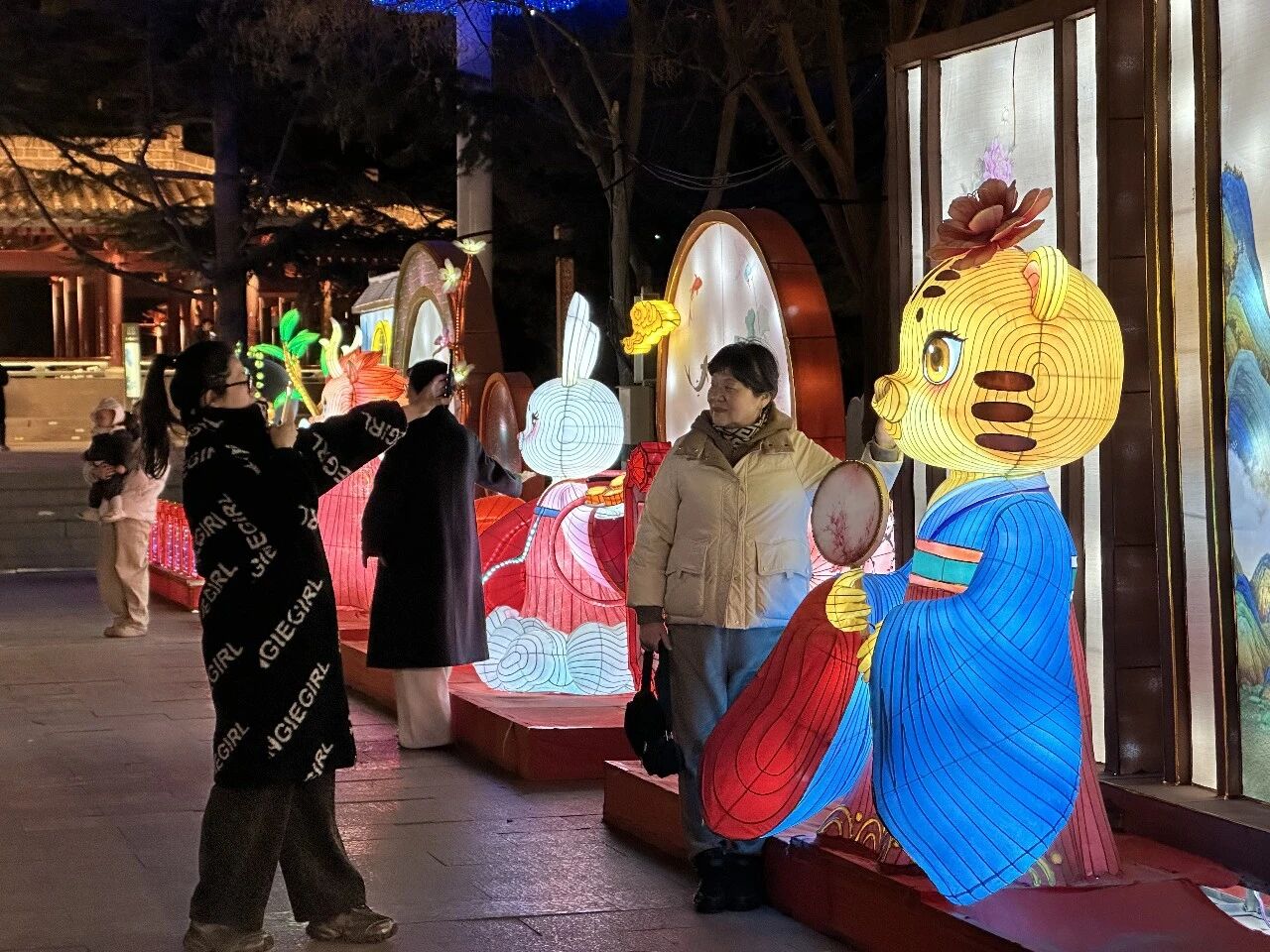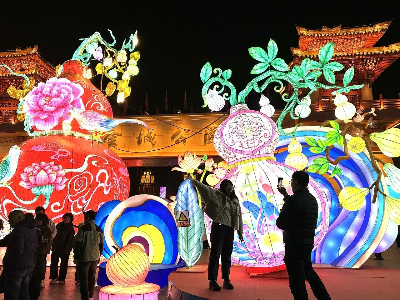 市民在金城公园与花灯合影