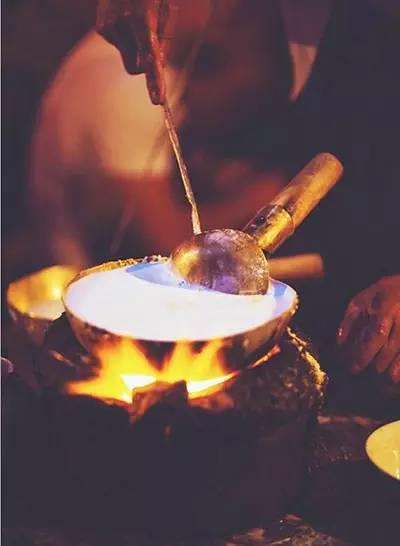 鸡蛋醪糟,用一个铜锅,先煮牛奶,再加入醪糟,然后再放入干果,葡萄干,最后把滚烫的牛奶倒入碗中,其成品黄白相间, 奶和米酒的香气让人陶醉,吃起来蛋花柔软, 滑嫩爽口,香甜略酸,色香味俱全。