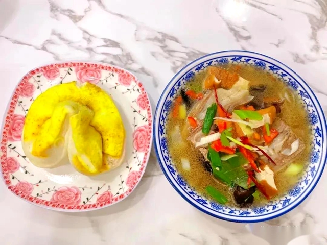 屋外寒风萧瑟,你的面前摆着热腾腾的一大碗,擓上一勺油泼辣子,浇上半圈香醋,再搭配上一个暄暄的花卷或大饼。一碗小小的临夏烩菜,保暖又养生?来看看它的主料,羊肉、牛肚、粉条、油炸豆腐、凉粉、木耳、萝卜,而羊肉是除湿去寒的食材,再放入其他配料,兑入煮好的羊肉汤,想味道不鲜美都难,最后放点葱姜蒜苗,辣椒丝等佐料,最后打上菠菜、香菜,一碗简单又美味热气腾腾的临夏烩菜上桌啦!
