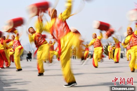 2019年2月19日,演员在黄河岸边的兰州水车博览园内进行太平鼓表演,欢庆元宵佳节。(资料图)杨艳敏摄
