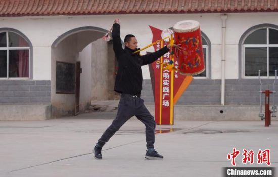 2月中旬,在兰州市永登县苦水镇,33岁邓鑫击打起太平鼓。九美旦增摄