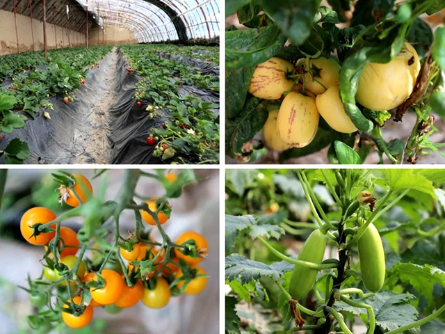 整个产业园内,60座温棚里种植着人参果、草莓、圣女果、西葫芦等10余种果蔬,任你采摘。一颗颗鲜红透亮的草莓挂满了藤蔓,香甜扑鼻。除了草莓之外,这里还种植了其他水果蔬菜:一个个硕大饱满的人参果缀满了枝头,香甜可口;一颗颗金黄色的圣女果挂满枝头,让人垂涎欲滴;大棚里长着西葫芦,有的开出了一朵漂亮的花,有的花上还长了一个小小的西葫芦。