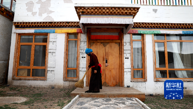 俄合拉村村民旦知草在自家的民宿前打扫卫生。新华社记者 任延昕 摄