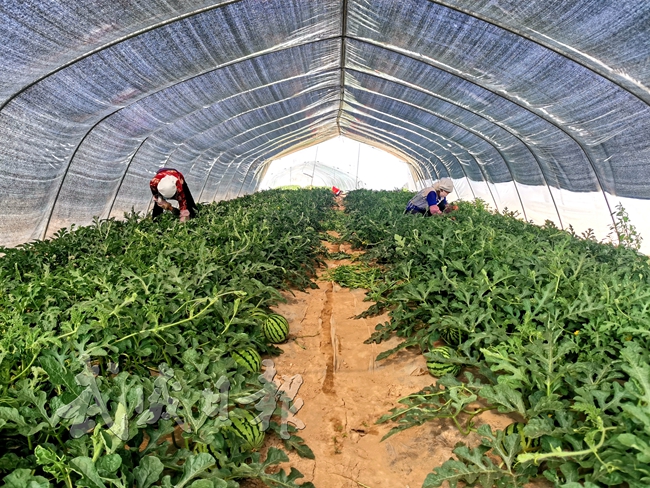 7月29日,古浪县定宁镇群众在打理瓜棚。今年以来,该镇立足乡村特色产业“延链补链强链”目标,依托“乡村振兴示范带”建设,打破村组界线集中连片流转土地2000亩,采取“产业链党支部+种植大户+农户”的发展模式,引进宁夏客商打造千亩拱棚麒麟西瓜种植示范基地,蹚出了群众增收致富新路子。