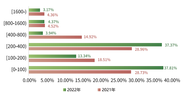 2021年与2022年甘肃乡村旅游游客出行距离分布(公里,%)