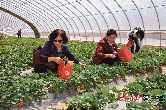 游客体验草莓采摘乐趣。