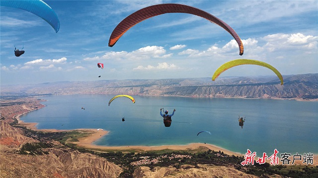 刘家峡国际滑翔营地滑翔伞飞行。
