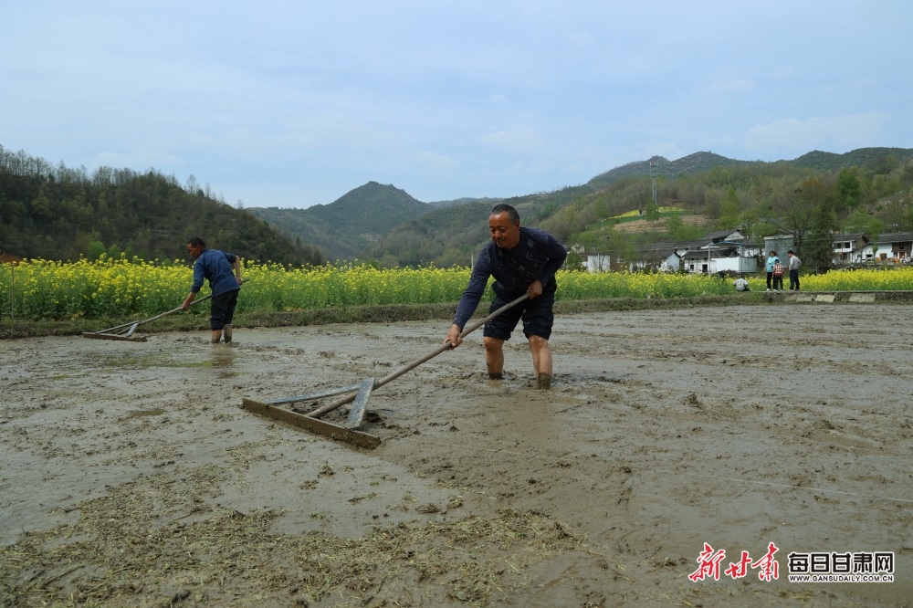 在康县大南峪镇花庙村水稻基地,村民在田间育秧。眼下,康县大南峪、阳坝、长坝等乡镇,稻农们抢抓农时开展水稻育秧工作,为今年的水稻种植打下坚实的基础。