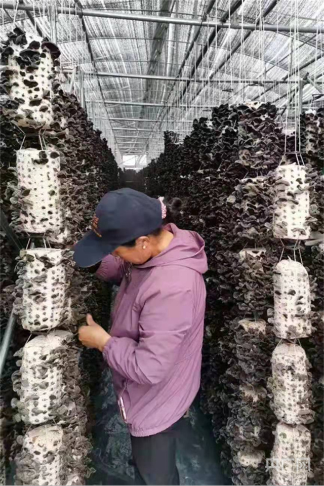 在青瓦寺村木耳基地里,处处弥漫着浓郁的菌香,一串串整齐排列的黑木耳菌棒上,长满了密密麻麻的黑木耳,柔软细嫩,晶莹剔透,工人们来回穿梭,双手飞快移动,熟练地将一朵朵黑木耳采摘下来。