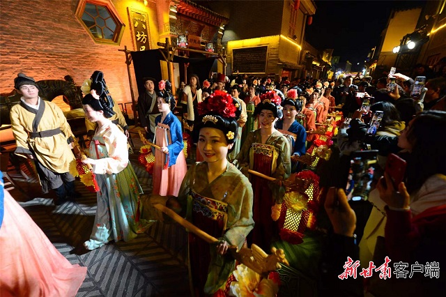 活动现场进行了无人机表演、灯光秀表演、歌舞开场秀,为观众呈现了现代科技和传统文化之美。随后,在八坊十三巷上演了大型沉浸式实景文旅剧《花开临夏五千年》,演员们边走边演,移步换景,通过沉浸式、故事化演绎的方式,充分展示临夏牡丹、“花儿”、饮食等临夏特色文化元素,全方位展现临夏市历史人文、风土民情、特色美食。
