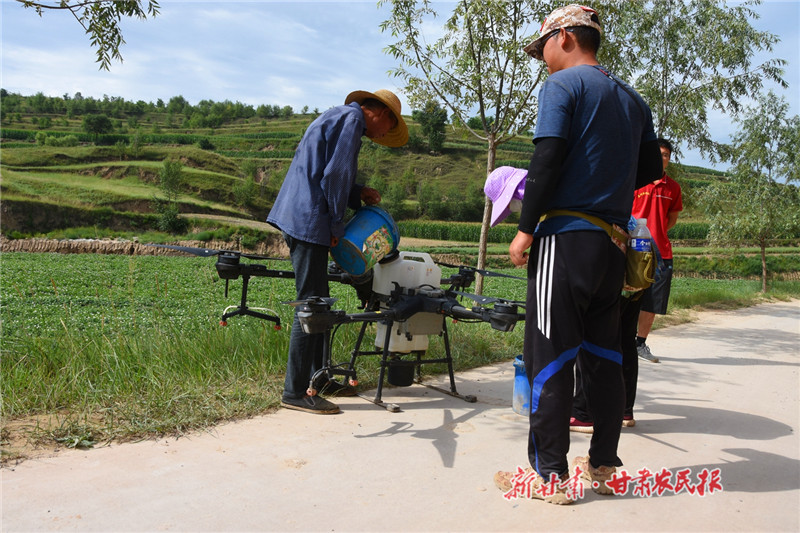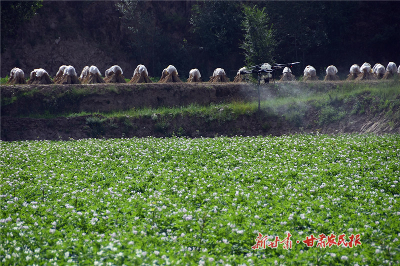 八月,正是马铃薯生长的时节。静宁县原安镇苏赵村土地股份合作社千亩马铃薯丰收在望,无人机正在田间喷洒农药。“近几日,接到政府抓好马铃薯晚疫病防控工作的通知后,我们立即通知群众做好自家马铃薯防疫工作,及时安排做好合作社千亩马铃薯防疫工作。”苏赵村党支部书记王筛良站在地头一边看无人机作业一边告诉记者。因种植面积大,单纯靠人工喷洒农药根本来不及预防疫病,也将大大增加种植成本,原安镇政府积极衔接农技中心,支援了三架无人机喷洒农药。